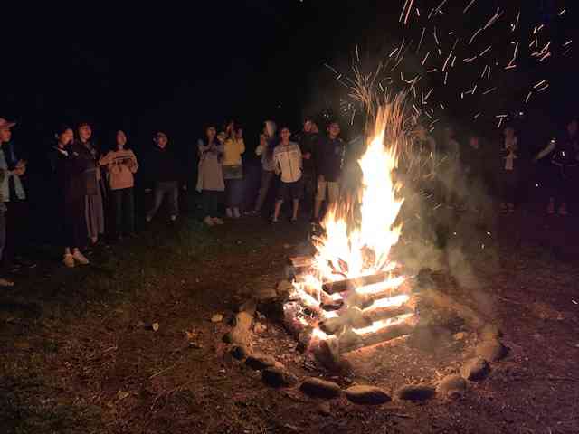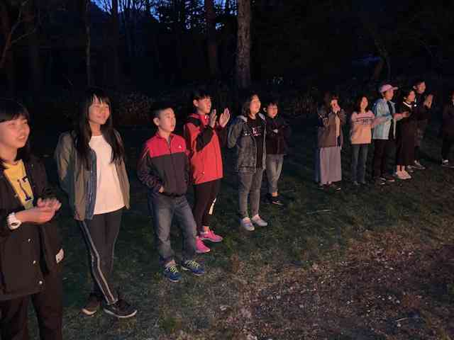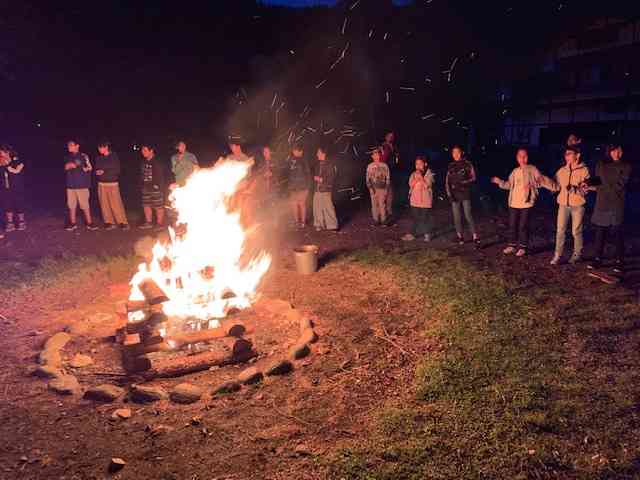 お楽しみのキャンプファイヤーは、燃え盛る炎を中心にしてみんなで盛り上がりました。今日はすべて予定通りできました。子供たちは横になりました。明日は6時に起きて散歩をしてから朝食の予定です。明日もホームページをお楽しみに♪