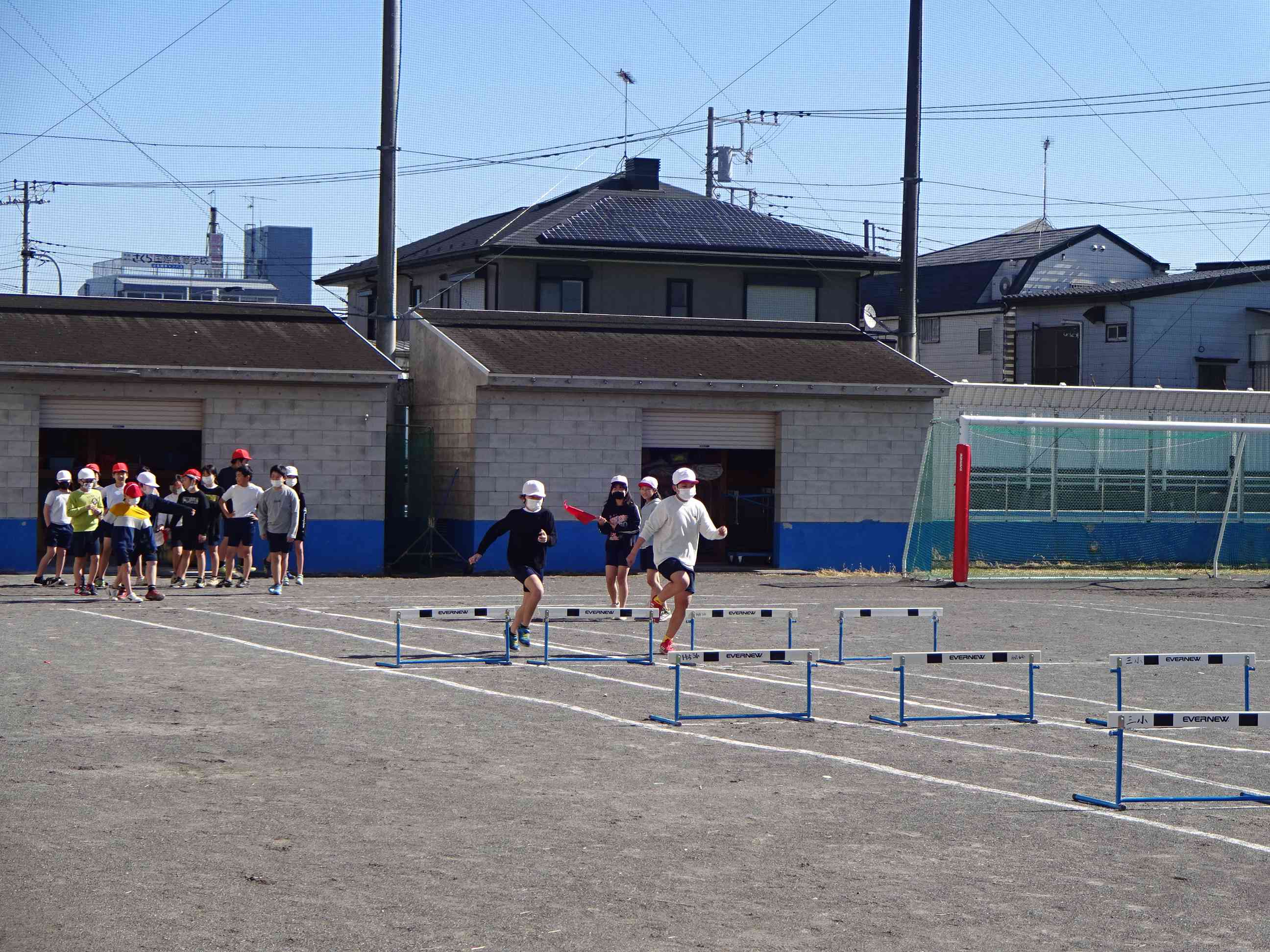 5年生の体育では、ハードル走を練習しています。この日は2回目の記録会でした。みんなベストタイムを出そうと一生懸命にハードル走を行っていました。
