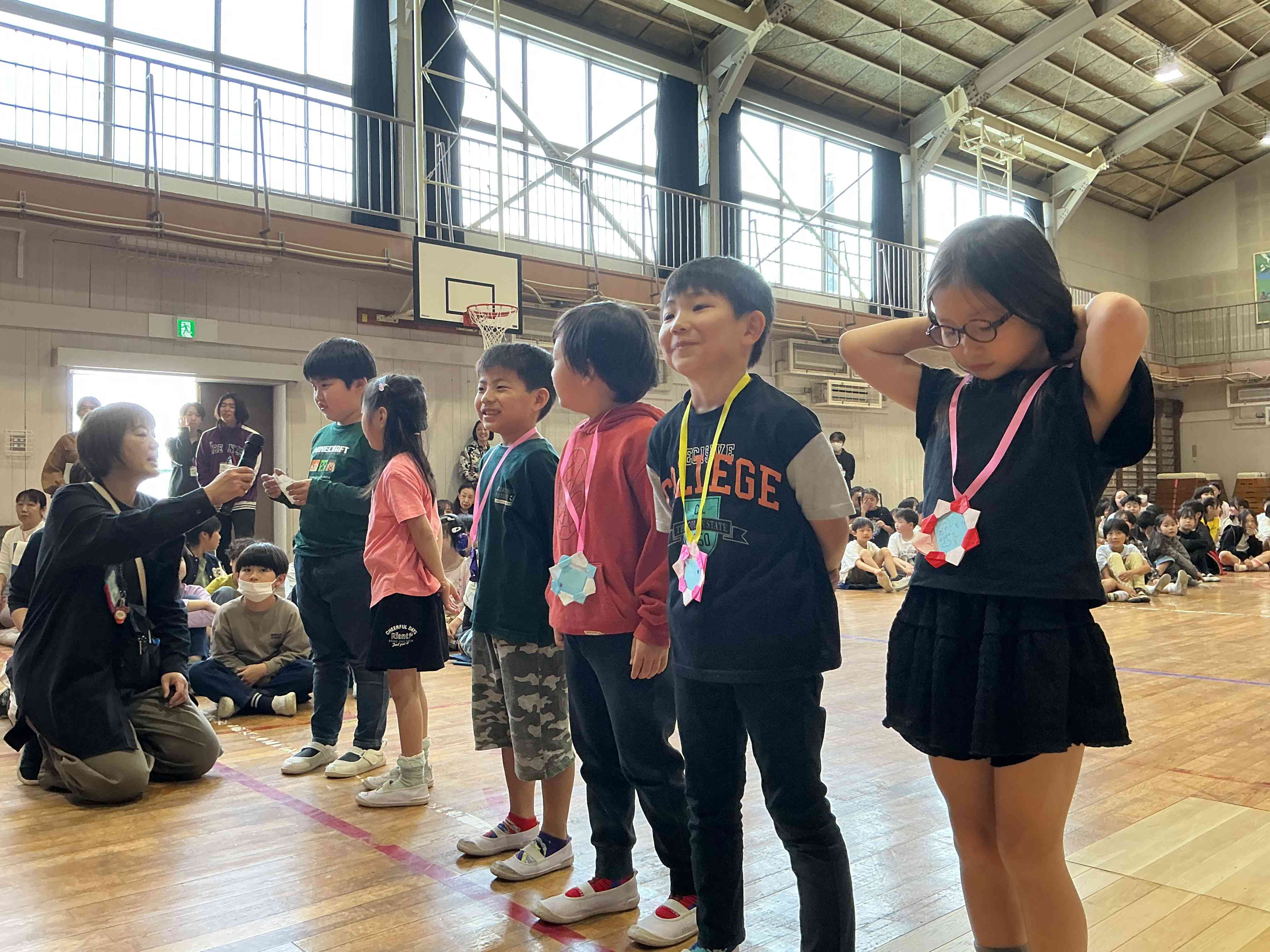 1年生が入学してくるのを楽しみにしていた2年生。22日に「1年生を迎える会」がありました。2年生はプレゼントを渡す役になりました。代表が「迎える言葉」を言った後、一人一人にアサガオの種がついたメダルをかけにいきました。「喜んでくれて嬉しかった!」と誇らしげな表情が印象的でした。5月には1年生にいろいろな場所を案内する「学校探検」が予定されています。お兄さん、お姉さんとして、頑張っています!